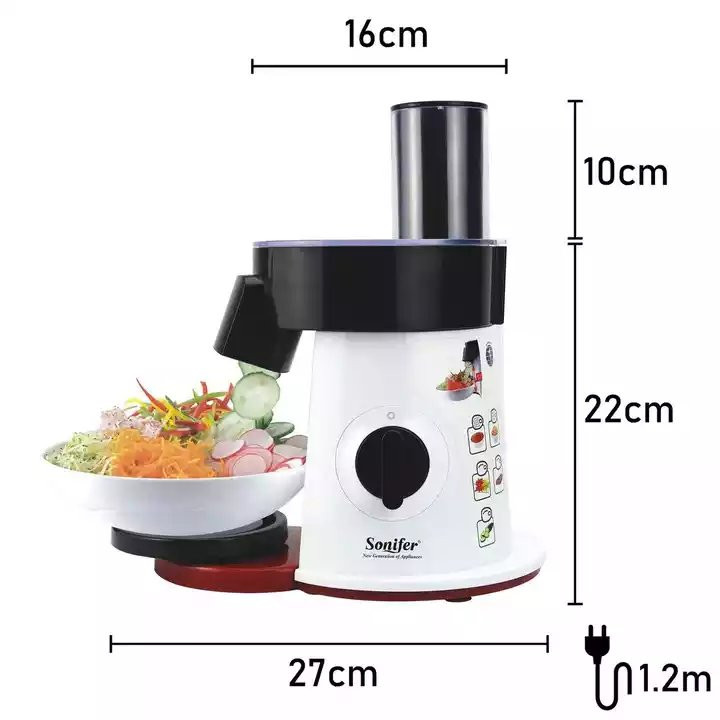 سالاد ساز و رنده برقی سونیفر مدل SF-5505 یک وسیله آشپزخانه است که برای خرد کردن و رنده کردن انواع مواد غذایی به کار میرود. این دستگاه دارای ۵ تیغه استیل ضد زنگ برای برشهای مختلف است و توان مصرفی آن ۲۰۰ وات میباشد.
